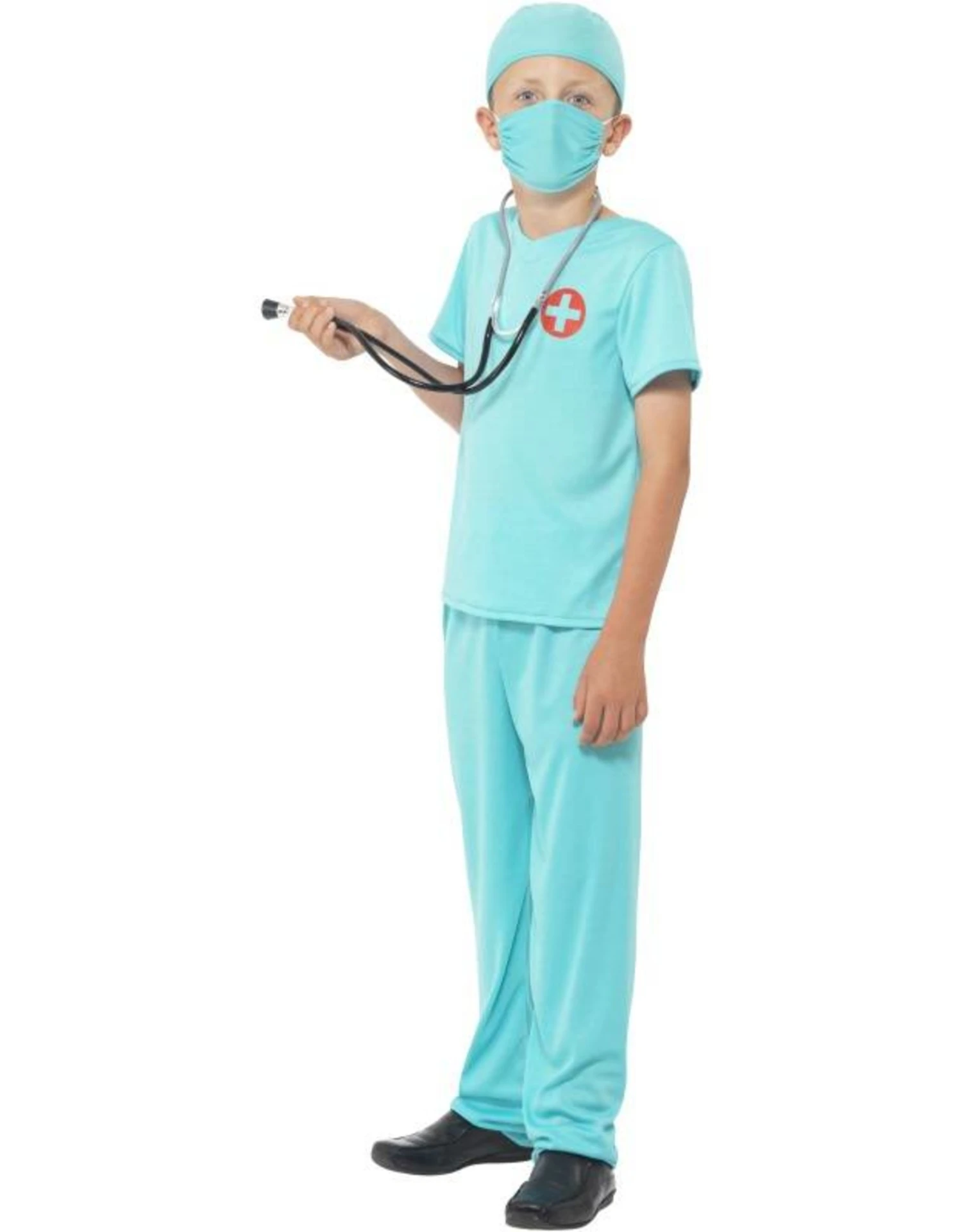 Dit kostuum bestaat uit een shirt, broek, muts, mondkapje en stethoscoop.