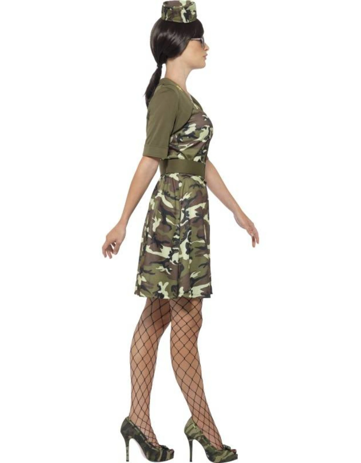 Dit kostuum bestaat uit een jurk, jasje, riem, hoed en pilotenbril.