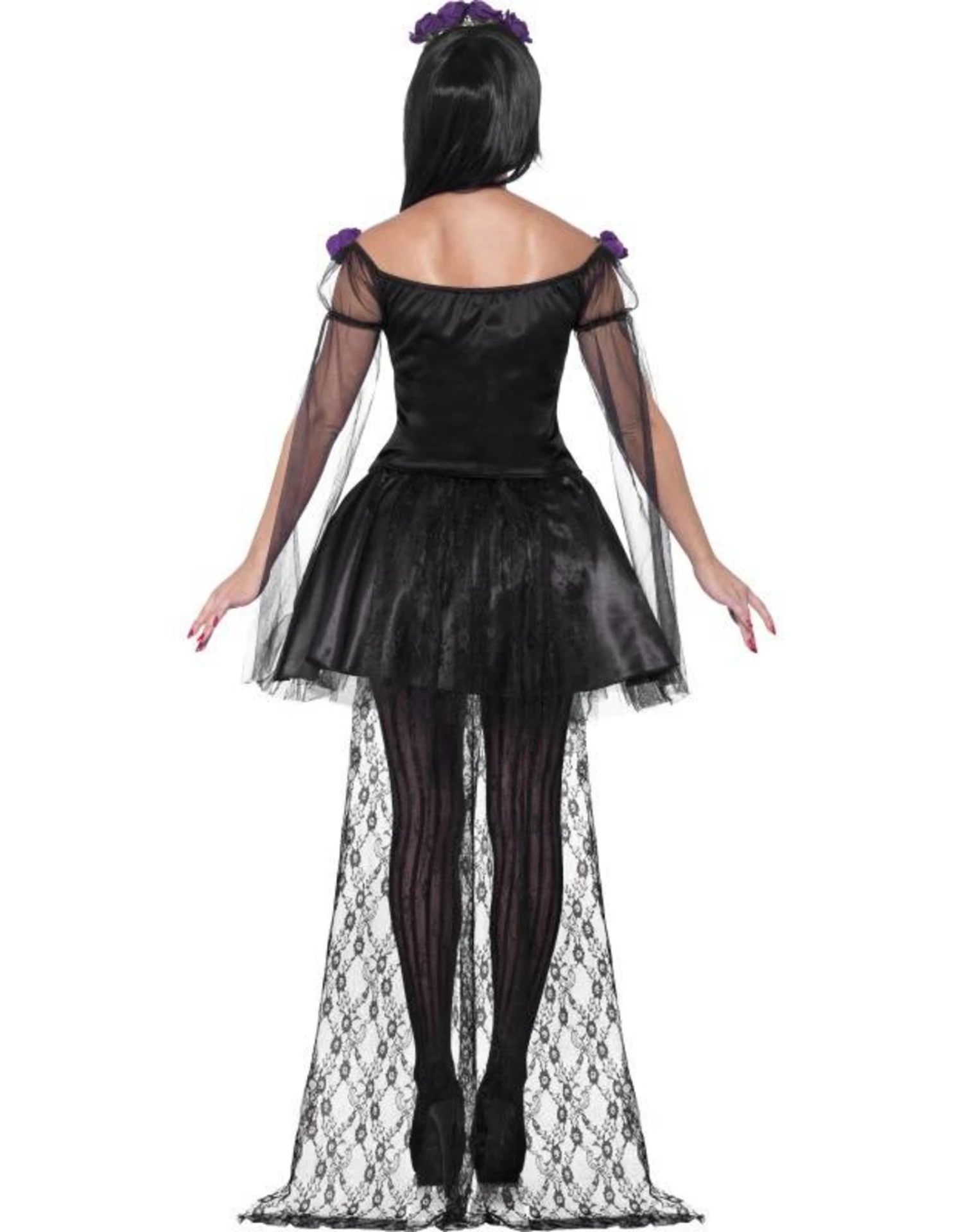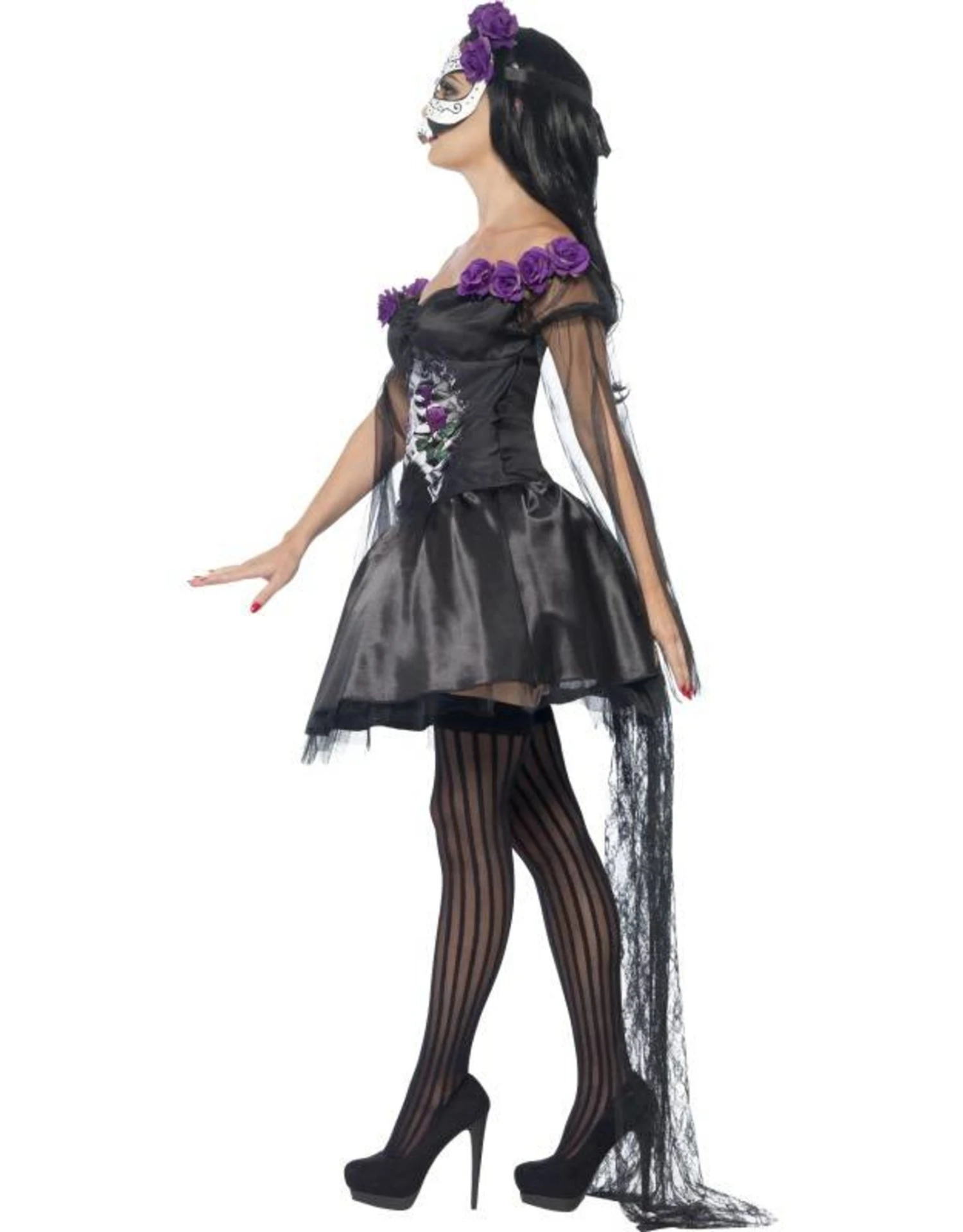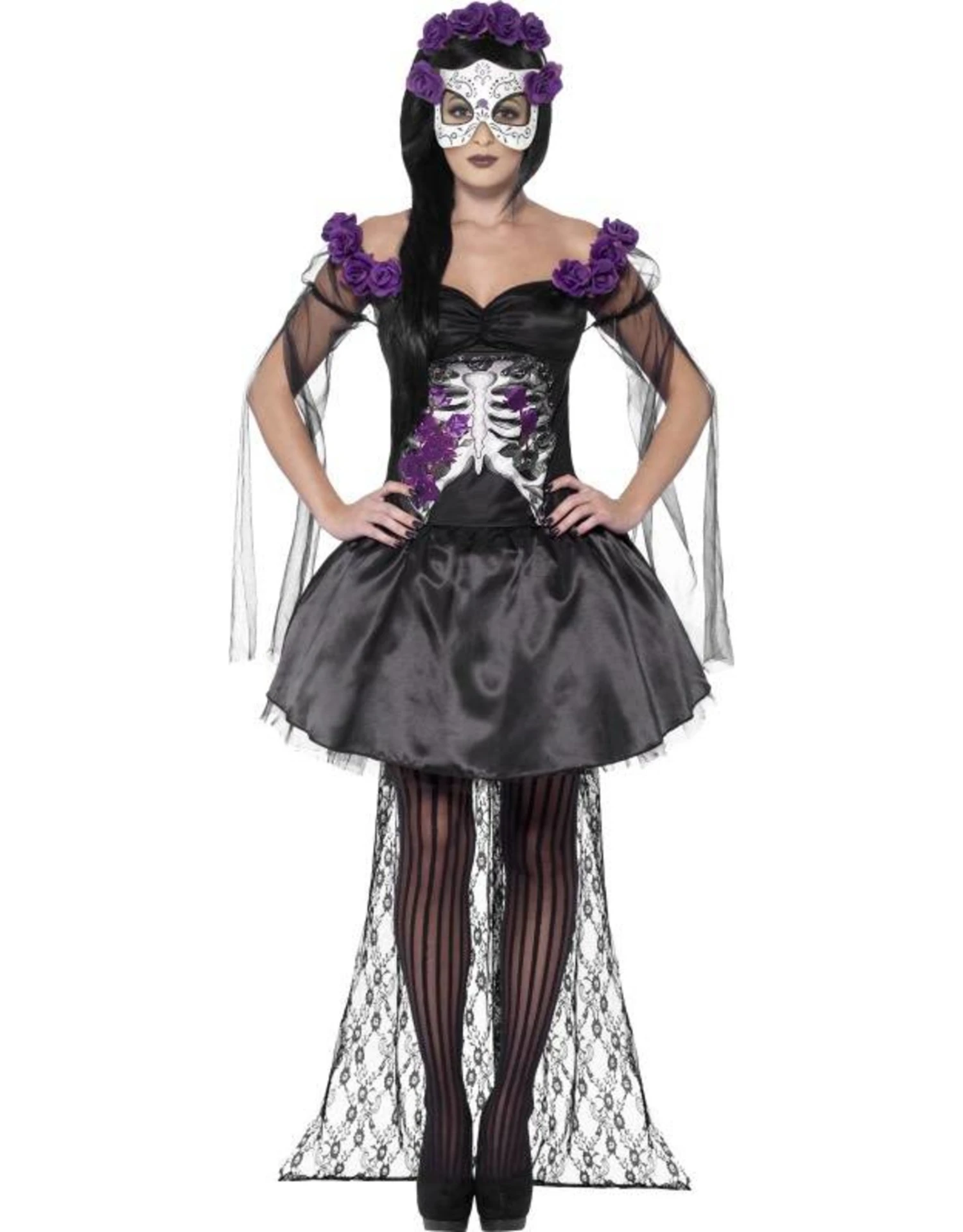 Dit kostuum bestaat uit een shirt met print, rok, diadeem met paarse rozen en masker