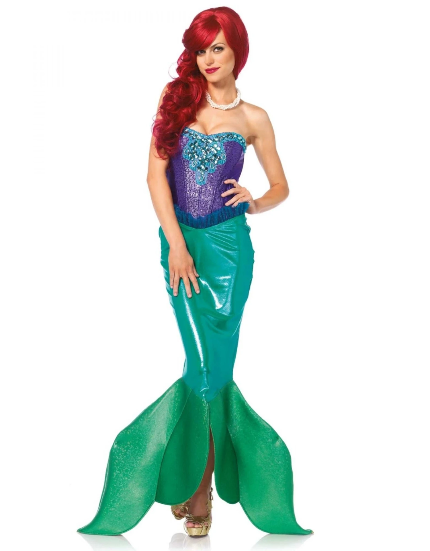 2-delig zeemeermin kostuum bestaat uit een bustier met lovertjes en juwelen detail en een glanzende rok met tulle aan de bovenkant.