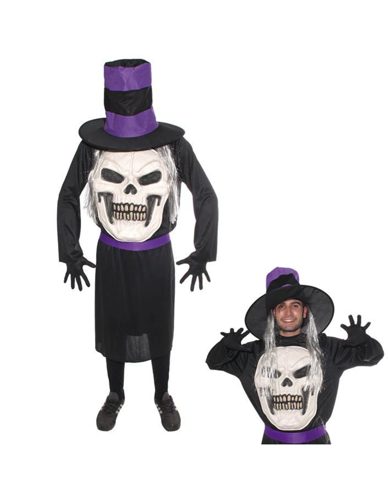 Dit kostuum bestaat uit een gewaad, opgenaaid masker, hoed met haar en riem.