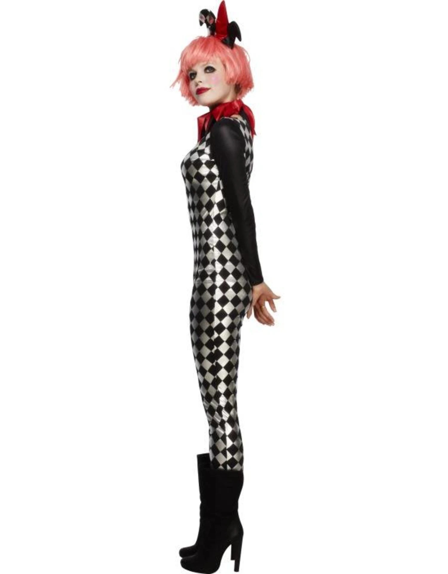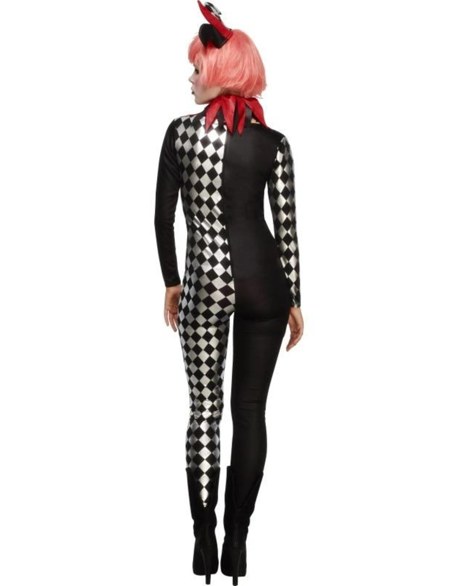 Dit kostuum bestaat uit een jumpsuit met een kraag en hoedje op diadeem.