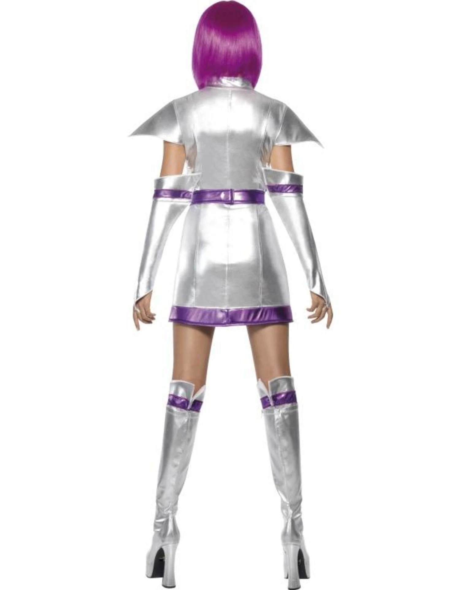 Dit kostuum bestaat uit een zilverkleurig jurkje met een riem, arm- en beenkappen