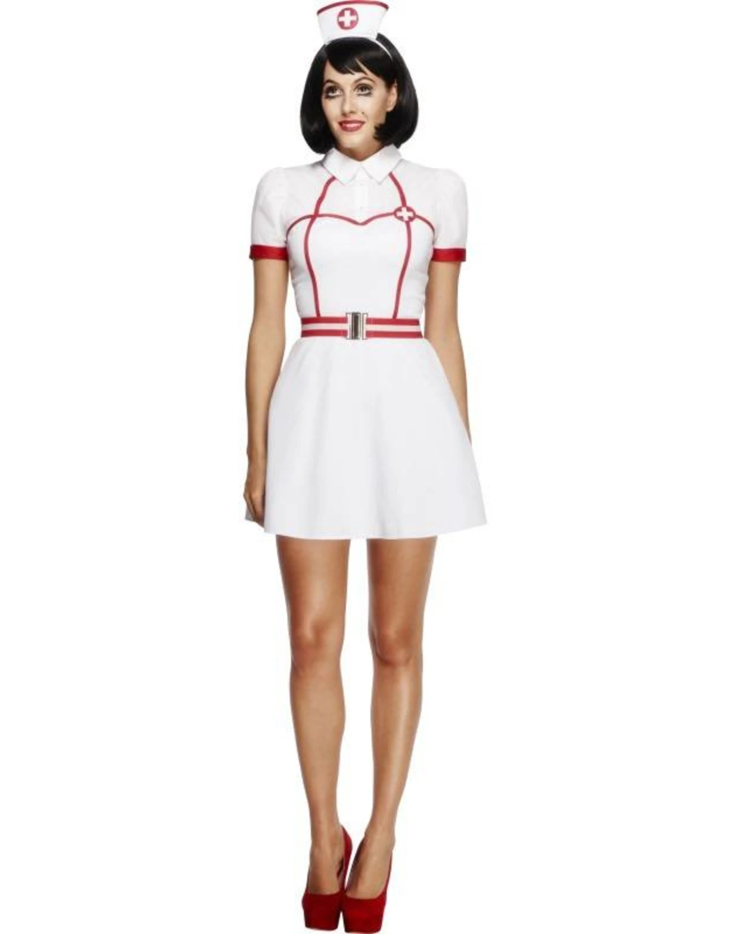 Dit kostuum bestaat uit een korte jurk , riem en verpleegsterskapje.
