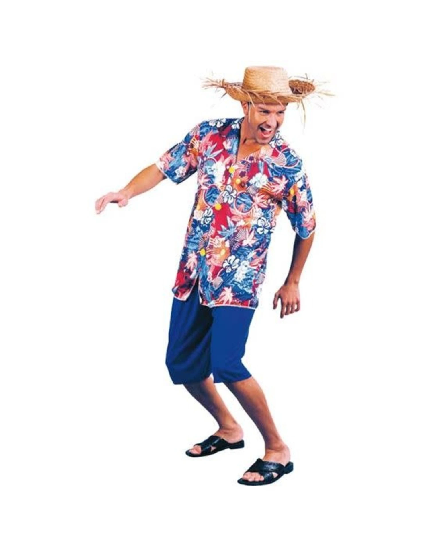 Dit kostuum bestaat uit een shirt, broek en hoed.