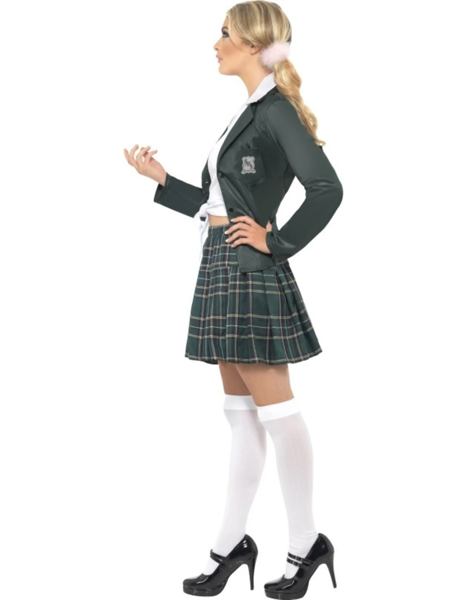 Dit kostuum bestaat uit een shirt, rok, blazer en maraboe-haarbandjes.