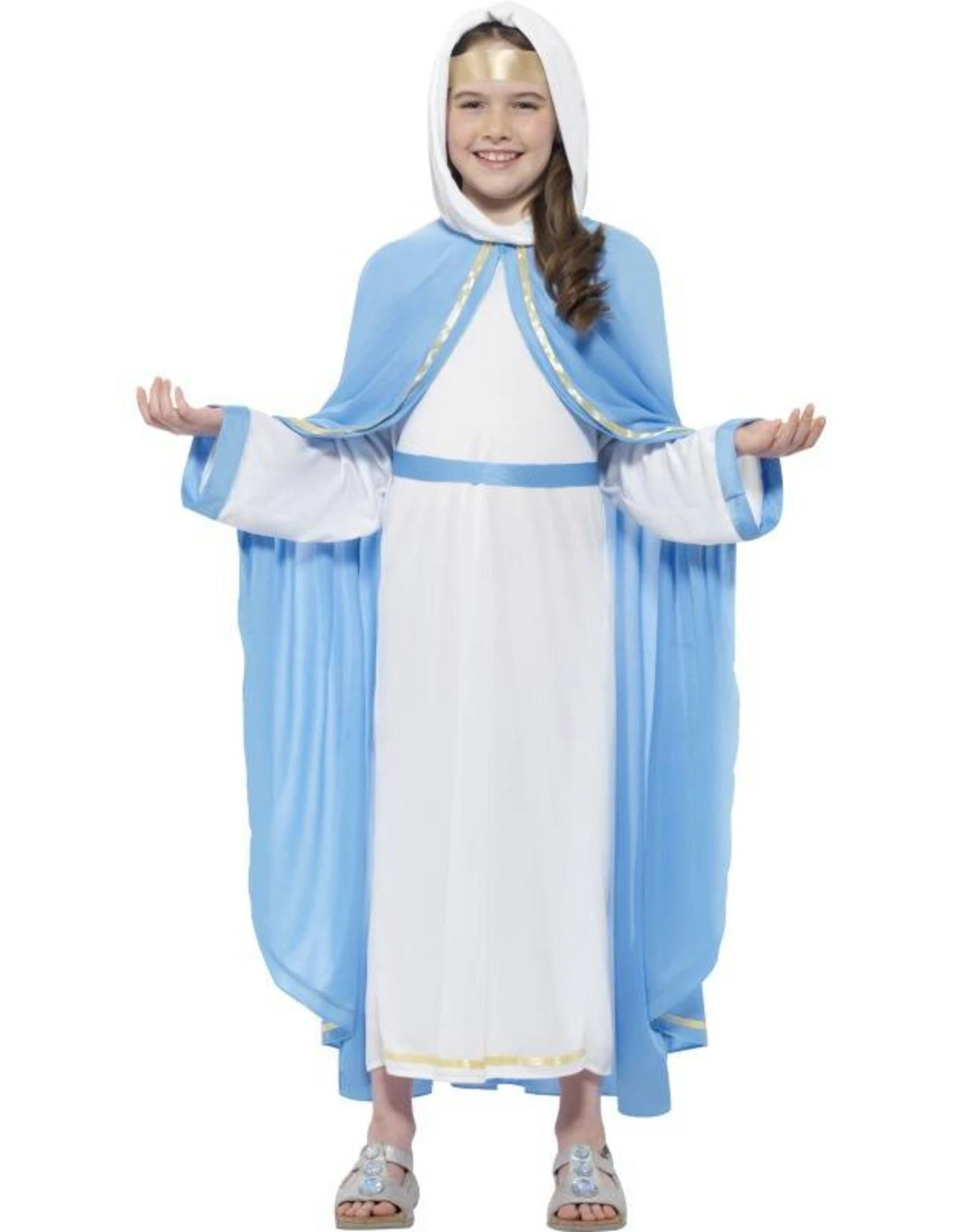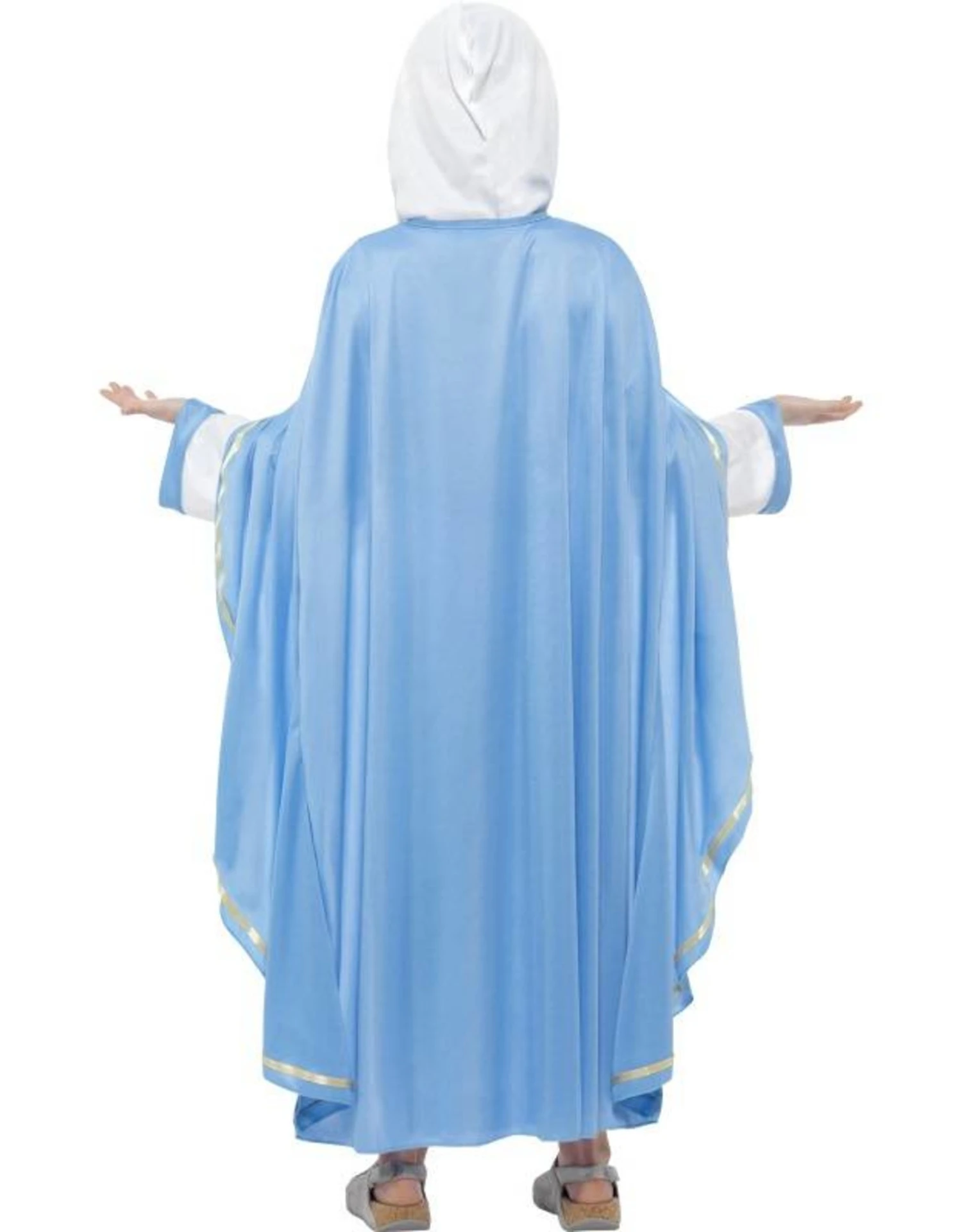 Dit kostuum bestaat uit een jurk, hoofddoek, cape en riem.