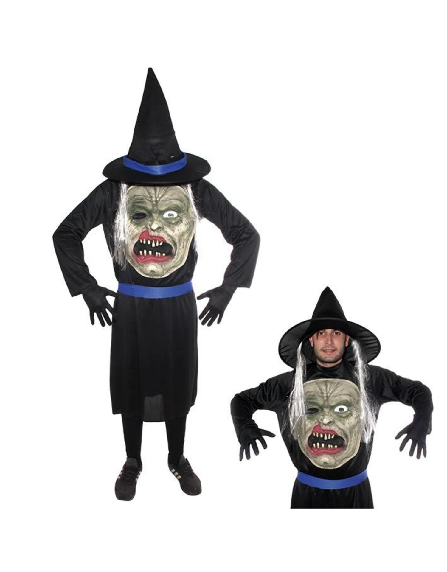 Dit kostuum bestaat uit een gewaad, opgenaaid masker, hoed met haar, riem.