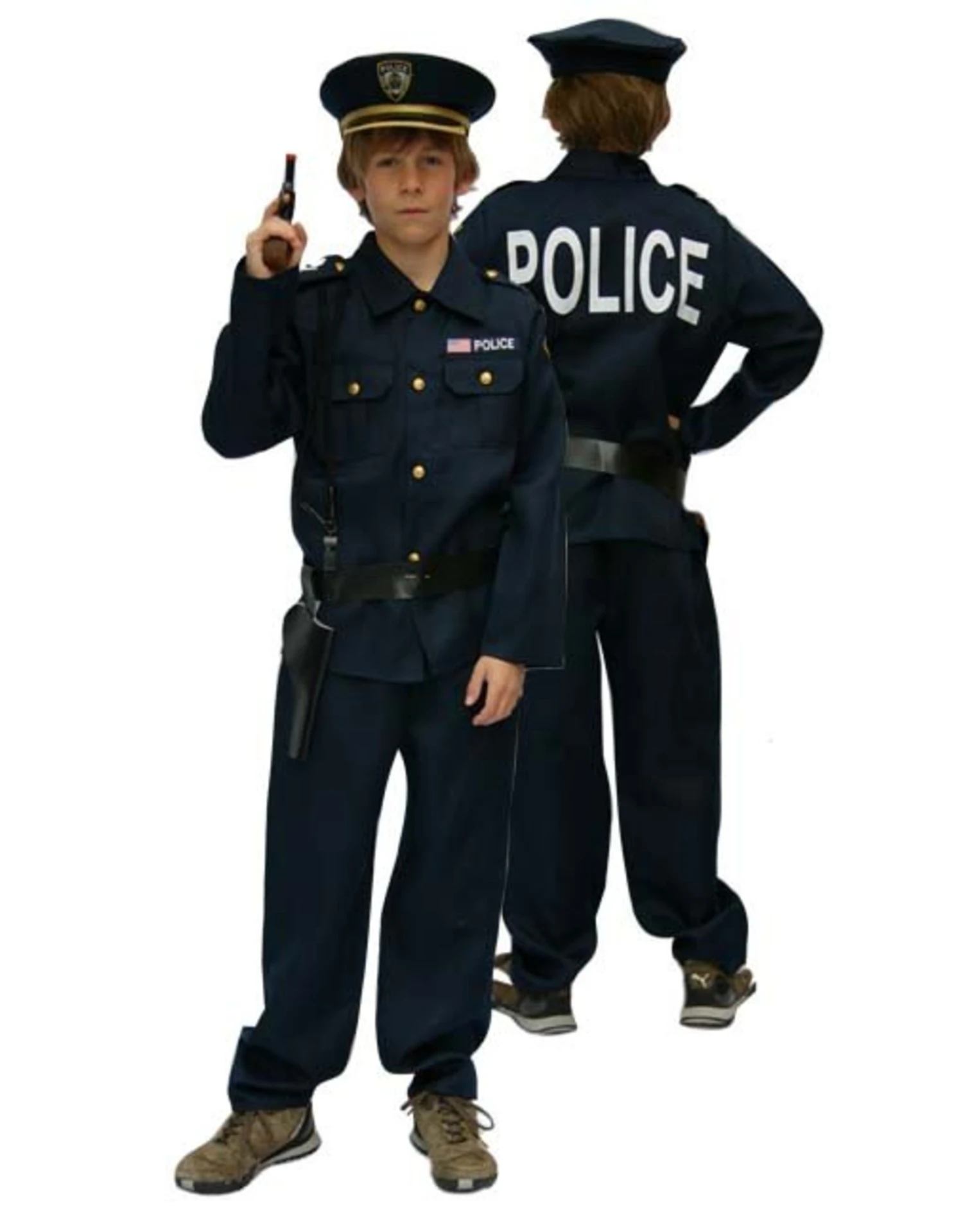 Dit kostuum bestaat uit een jas, broek, riem met houder, pet en fluitje. Pistool niet inbegrepen.