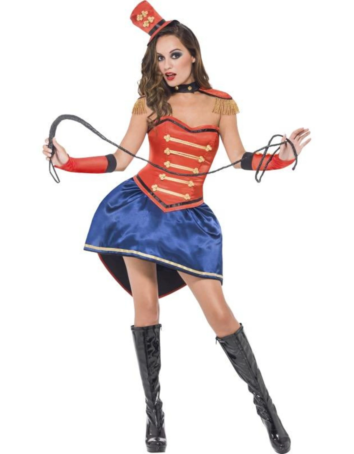 Dit kostuum bestaat uit een rode corset, blauw rokje, nekbandje, hoedje, handschoenen, epauletten