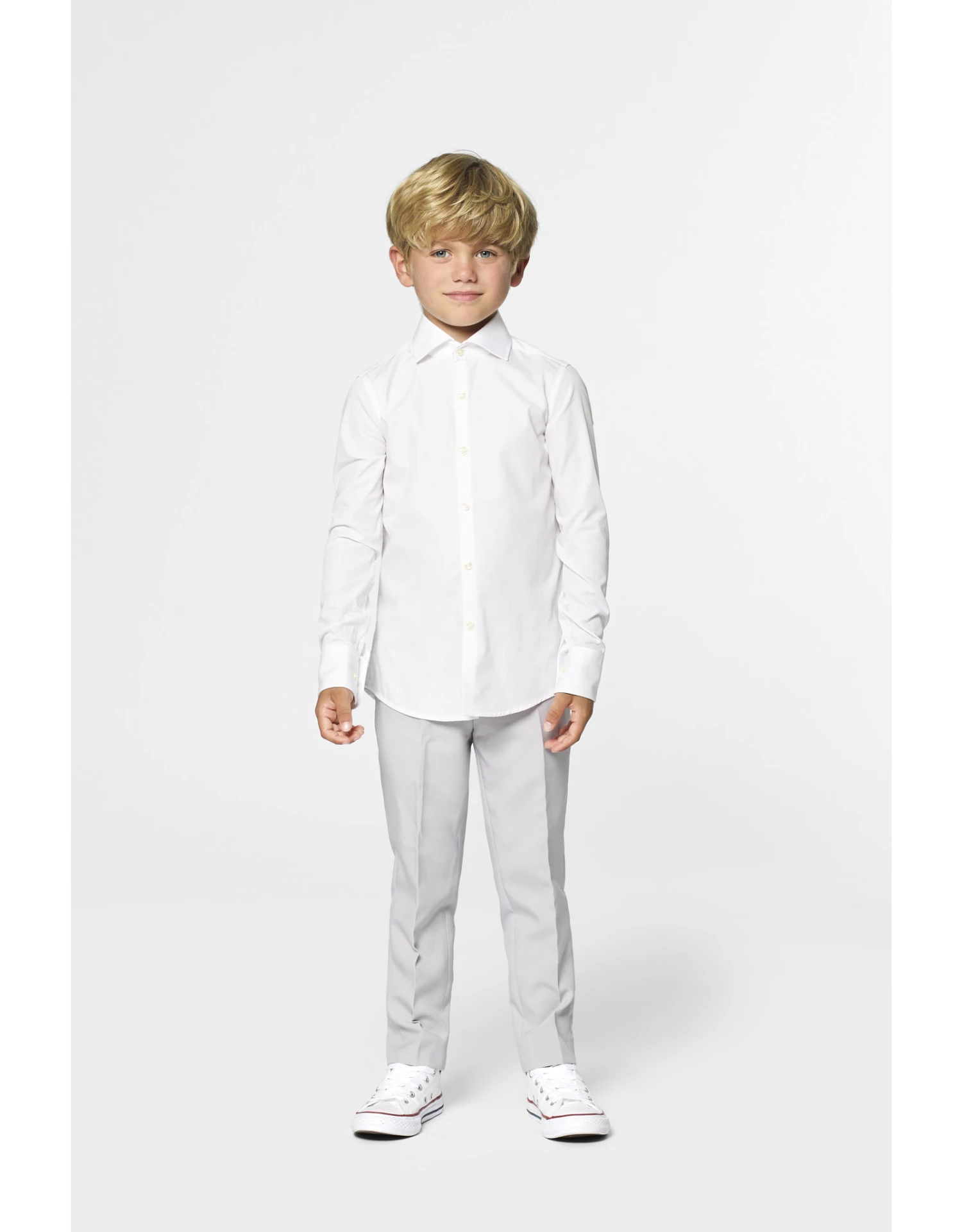 Op zoek naar een overhemd om de outfit van je kleine grote man compleet te maken? Dit witte jongens overhemd maakt elke look charmant en chic. Het is het ideale kledingstuk om met allerlei pakken te dragen, van uitgesproken tot basic varianten. Verder is het jongens overhemd lang genoeg om in de broek te stoppen – en daarin te blijven, zelfs als hij erin gaat spelen – want het is speciaal ontworpen om met een pak te dragen.