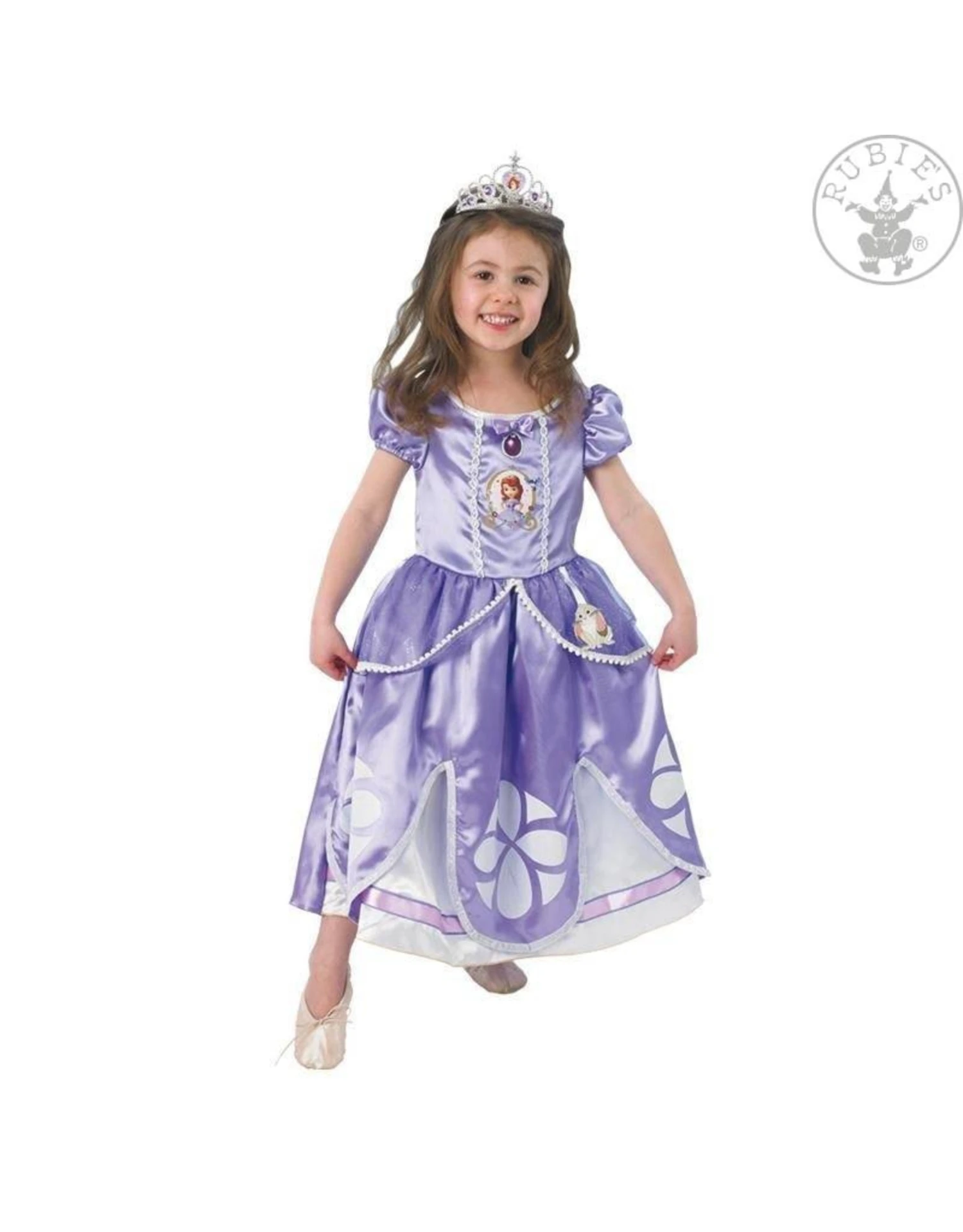 Paarse Sofia the First jurkje met in het midden een afbeelding van Sofia zelf. Inclusief diadeem.