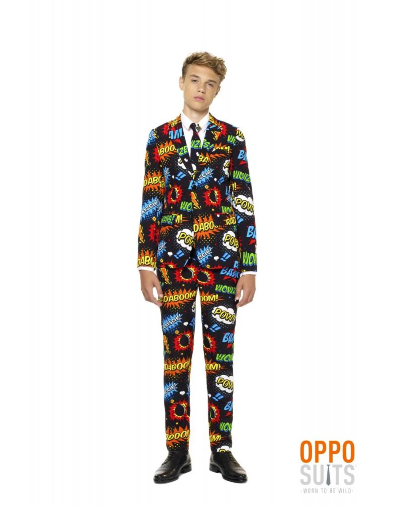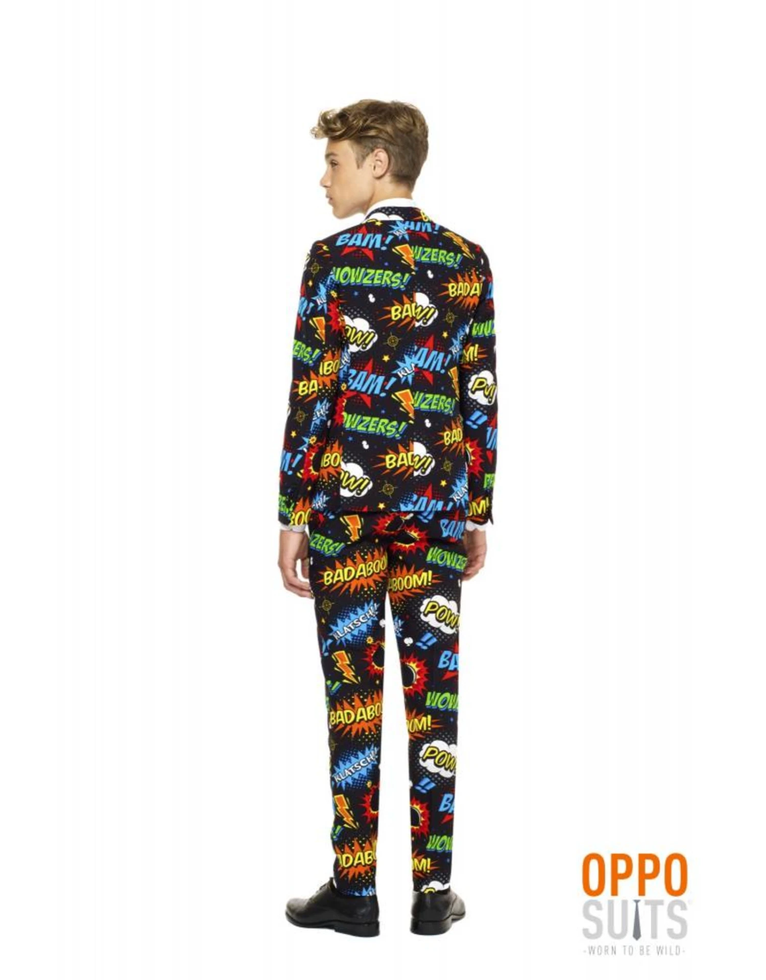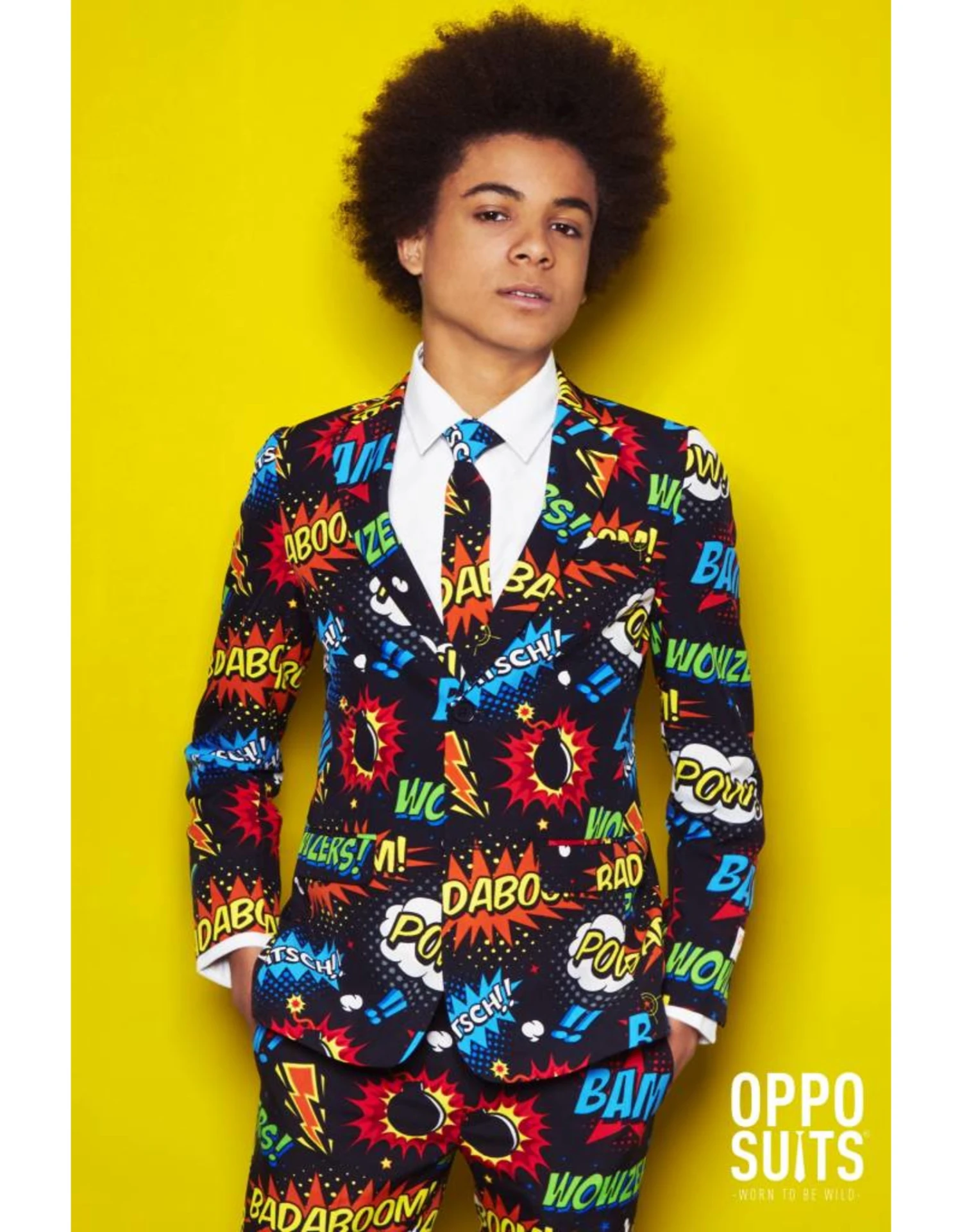 Wow! Zeg je saaie zwarte en blauwe pakken maar gedag en zeg “hallo” tegen dit stripboek thema Badaboom pak voor jongens! Ongeacht het evenement waar je naar toe gaat, dit pak zal aan niemand ongezien voorbij gaan. Badaboom badabeng!