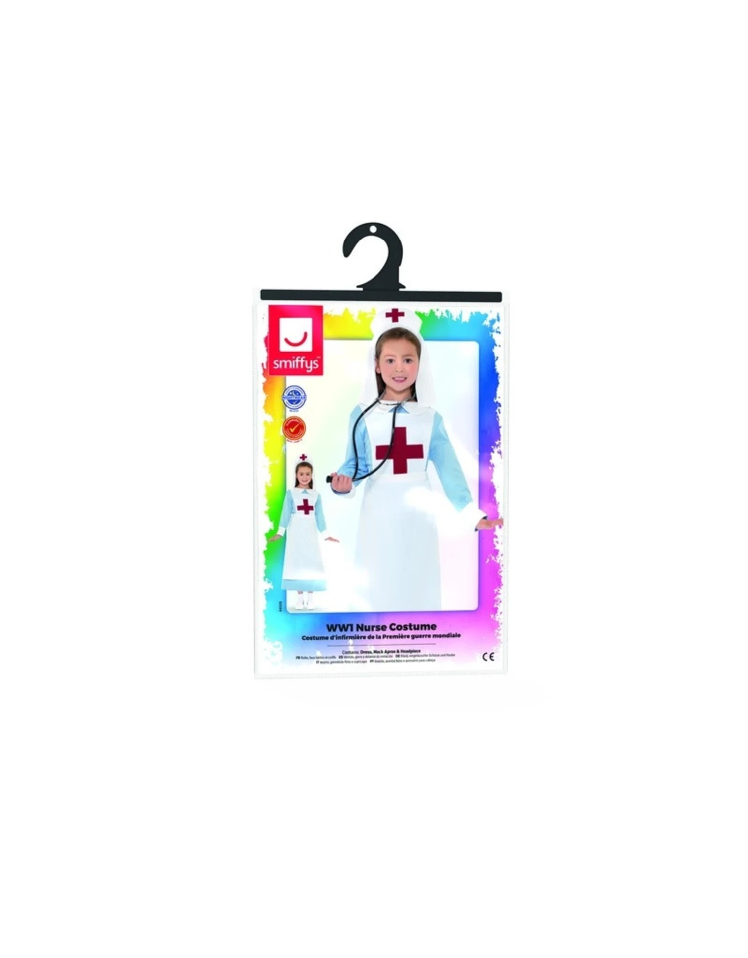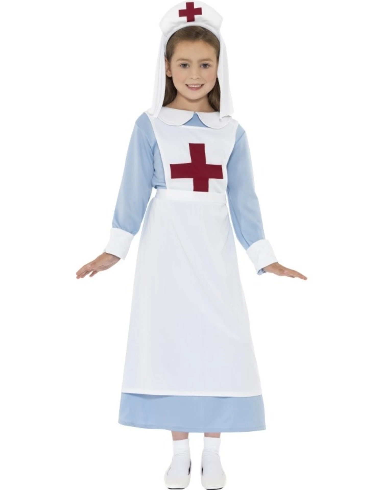 Dit kostuum bestaat uit een jurk, schort en verpleegsterskapje